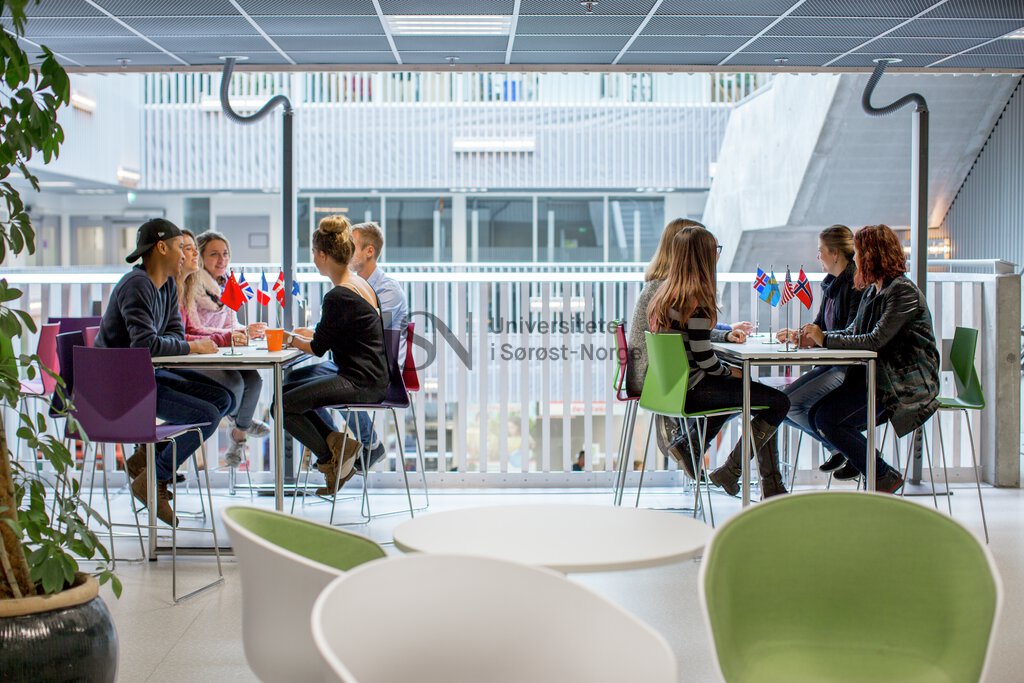 Studenter ved bord i moderne kantine med internasjonale flagg, fargerike stoler og glassvegger med utsikt over bygningens eksteriør.