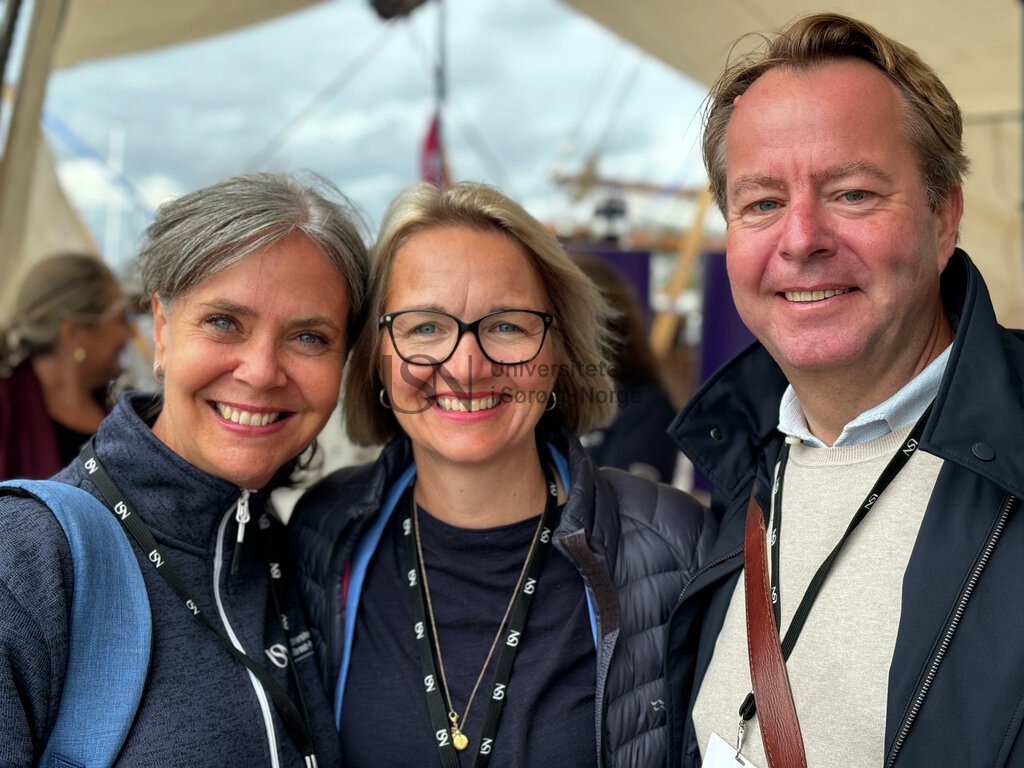 Tre smilende middelaldrende personer på et utendørsarrangement. To kvinner og én mann iført fritidsjakker. Båt synlig i bakgrunnen.