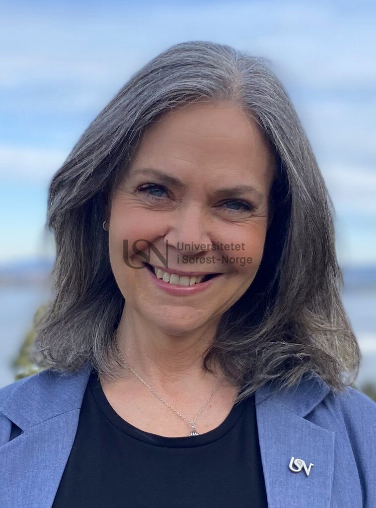 Smilende middelaldrende kvinne med langt grått hår iført blå blazer og svart topp mot uskarp utendørsbakgrunn.