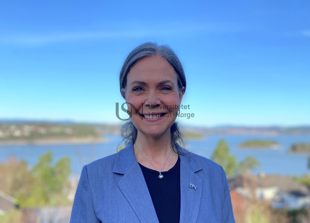 Smilende moden kvinne i blå blazer utendørs, naturskjønn innsjø og landskapsbakgrunn på solskinnsdag. Grått hår, profesjonelt utseende.