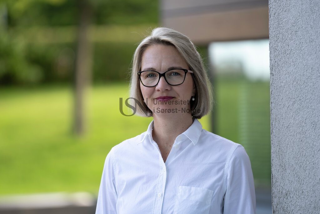 Profesjonell kvinne med kort blondt hår og briller iført hvit skjorte, står utendørs i nærheten av en bygning med grøntområder i bakgrunnen.