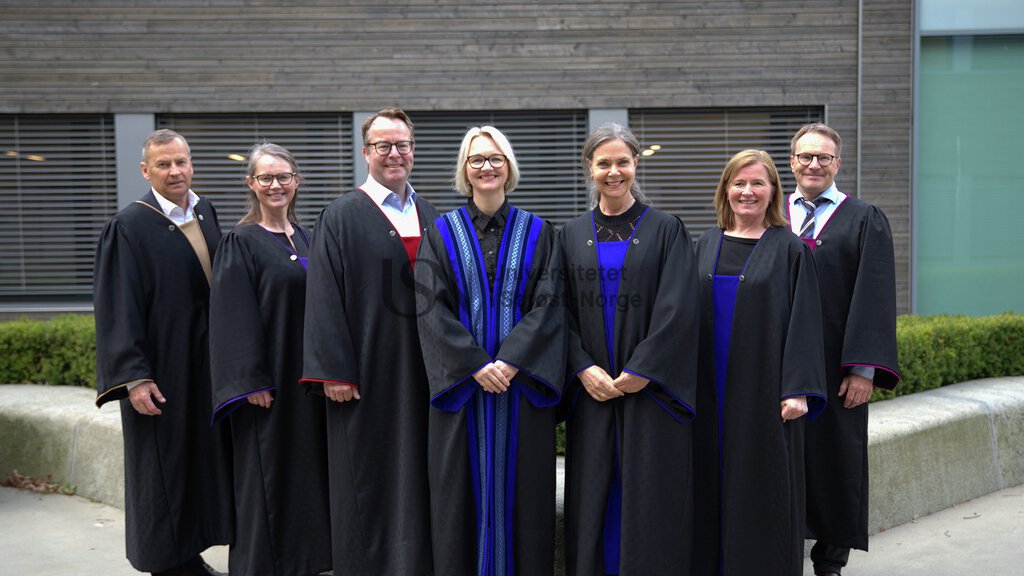 Dekan Hans Anton Stubberud (HH), dekan Elisabet Syverud (TNM), viserektor for utdanning Stephan Hamberg, rektor Pia Cecilie Bing-Jonsson, viderektor for forskning Heidi Ormstad, dekan Cecilie Varsi (HS) og dekan Per-Ludvik Kjendlie (HIU).