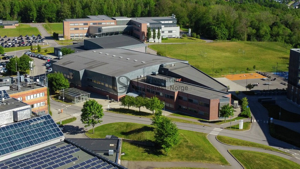 Luftfoto av moderne campusbygninger med solcellepaneler, parkeringsplasser, idrettsbane og omkringliggende grøntområder.