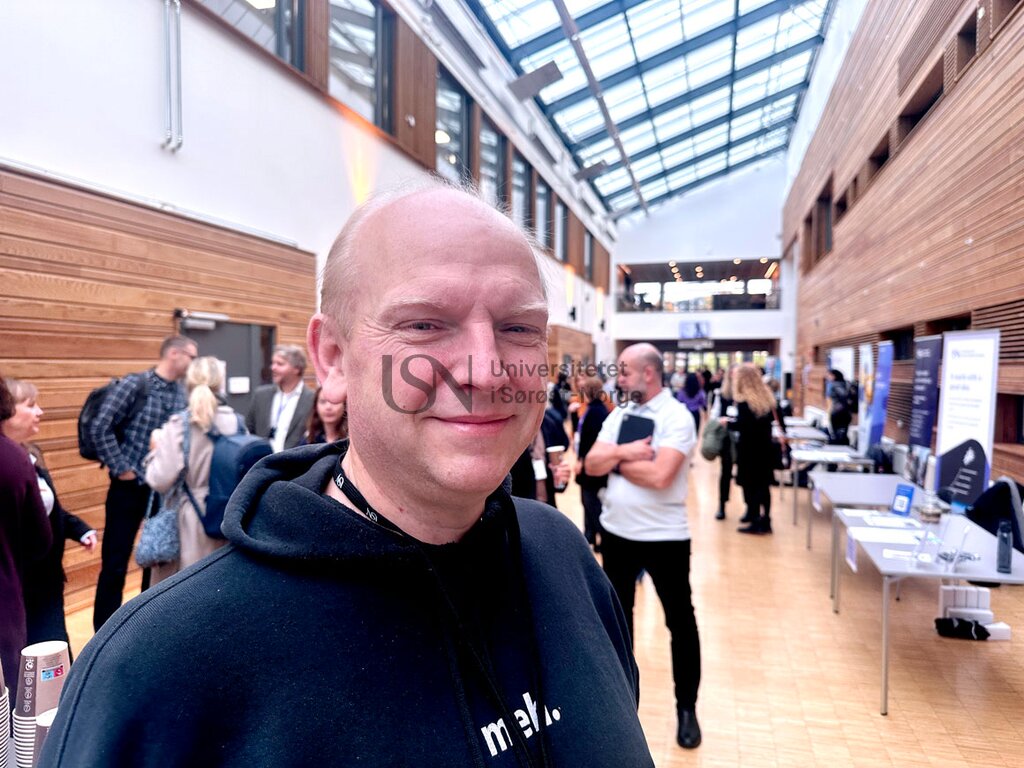 Portrett av Olaf Hallan Graven fra brystet og opp, ikledd sort hettegenser i biblioteksgata på campus vestfold