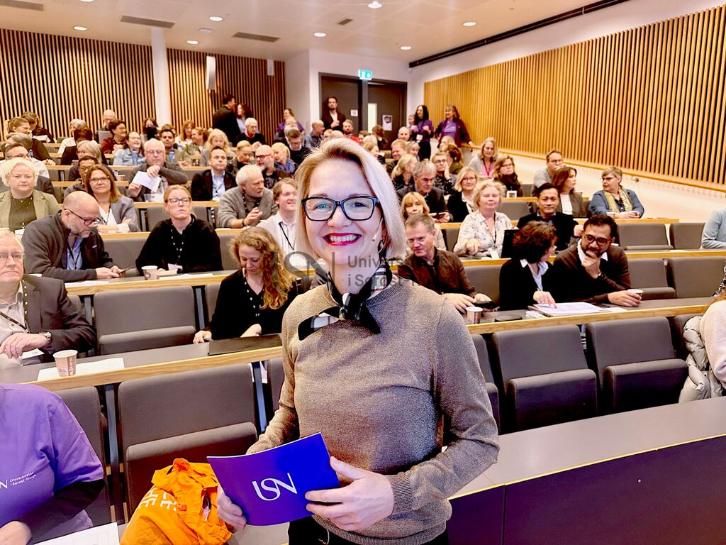 Portrett av rektor Pia Cecilie Bing-Jonsson fra livet og opp, smiler og ser rett i kamera foran et nesten fullsatt auditorium på en konferanse, showcase EU, på campus Vestfold, iført beige genser med silkeskjerf i halsen, holder lilla talekort med USN-logo foran seg i hendene.