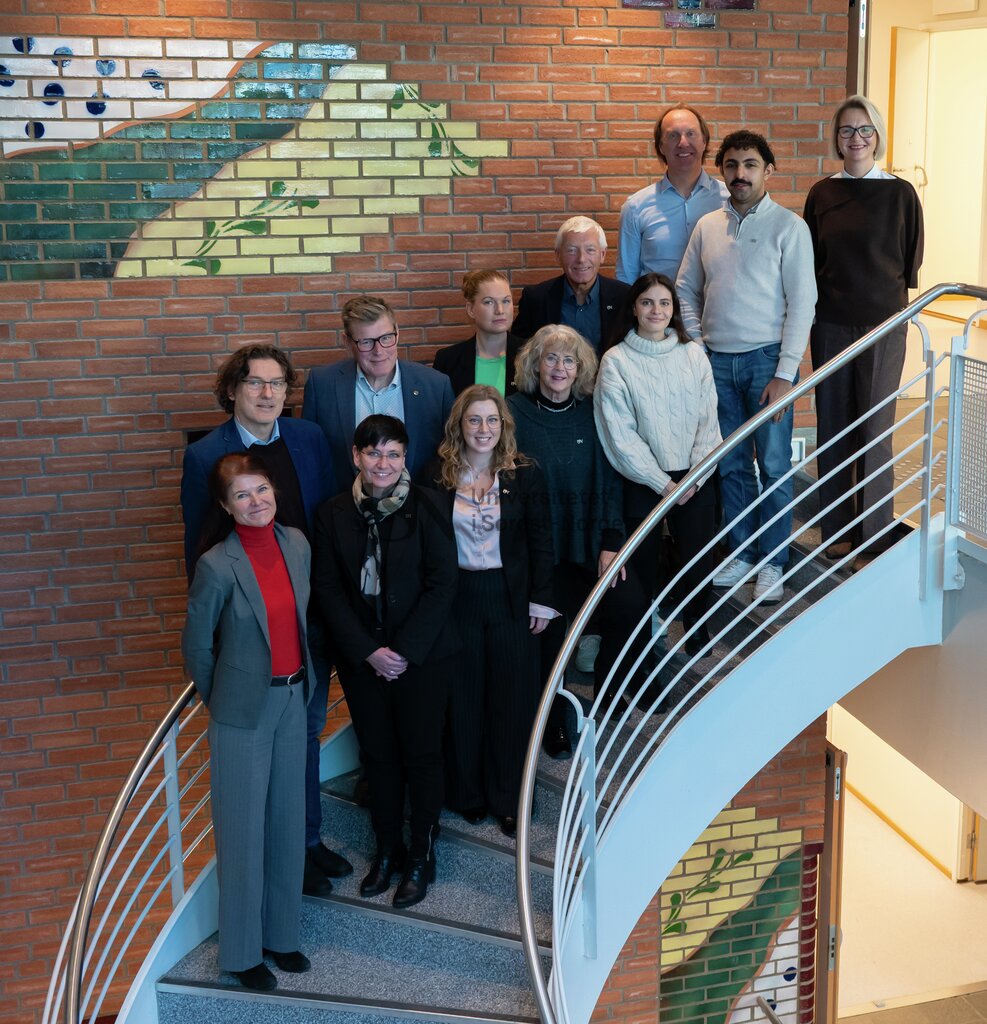 Gruppebilde av tolv fagfolk i trapper i lobbyen i kontorbygget, i ulike aldre og med ulik antrekk, murvegg i bakgrunnen.